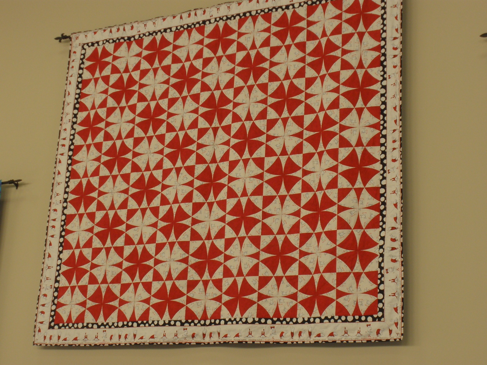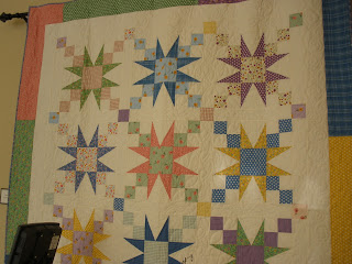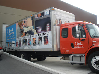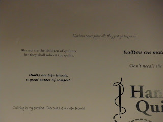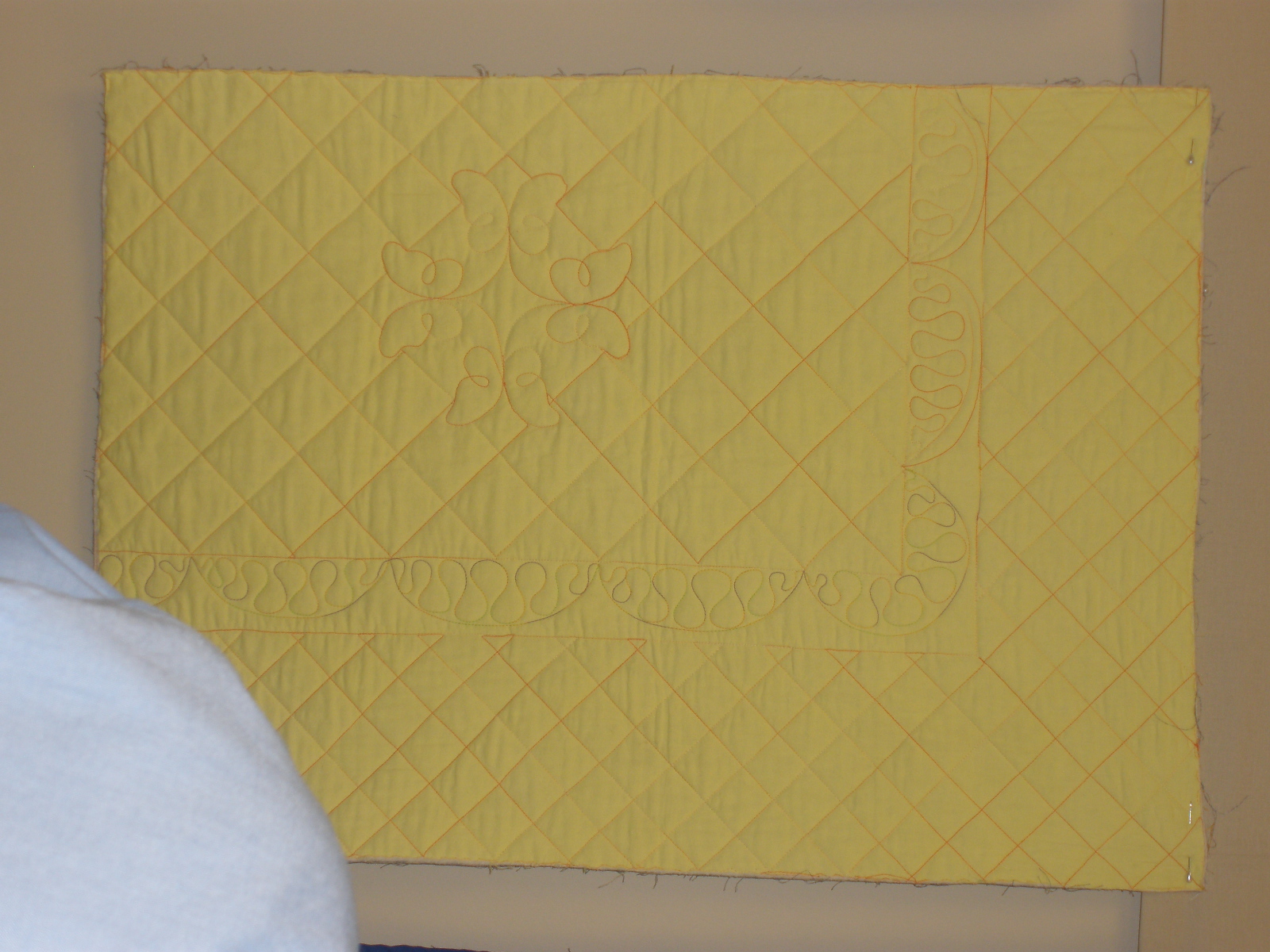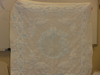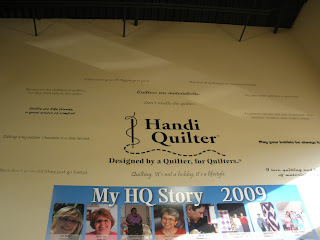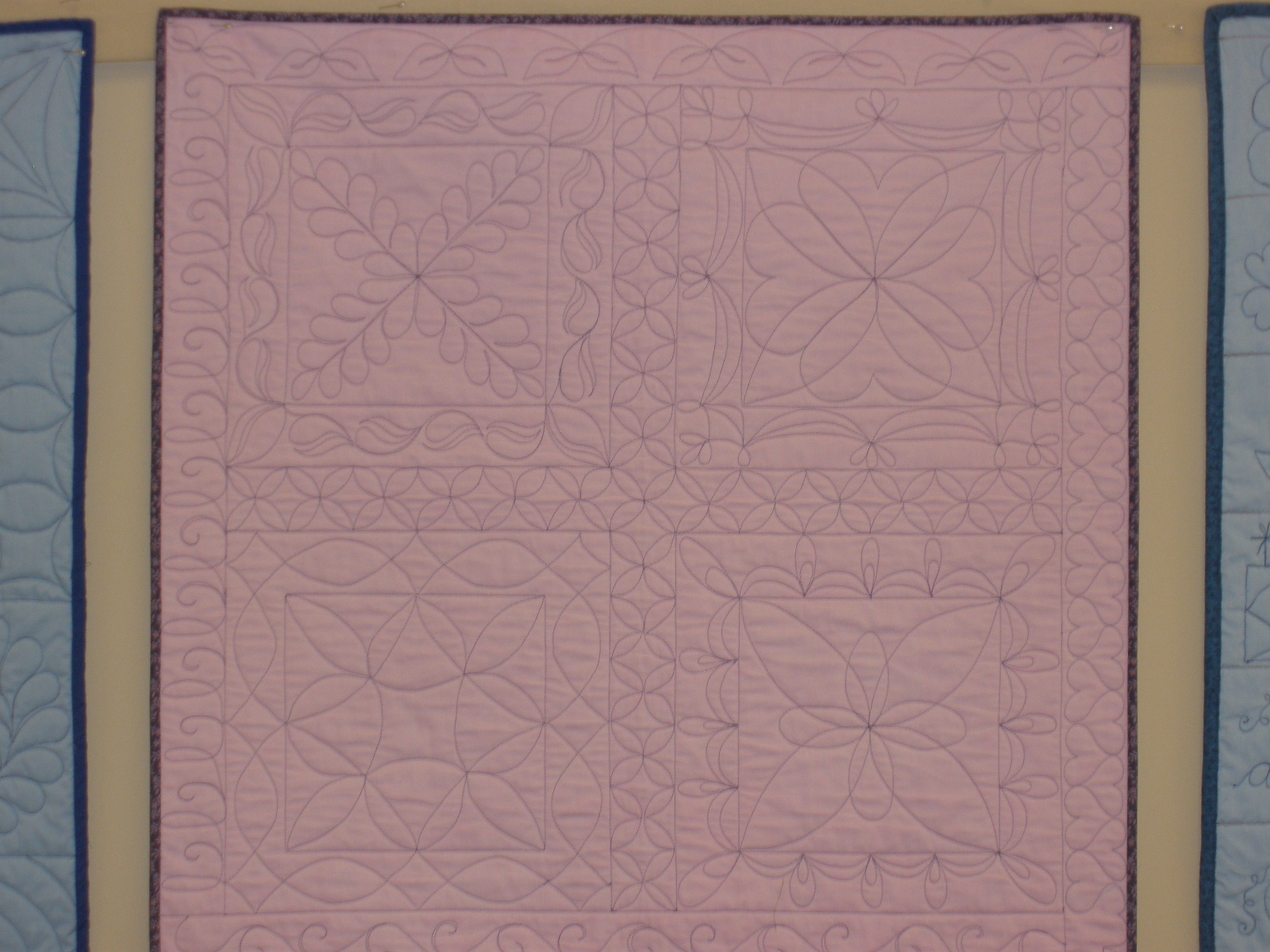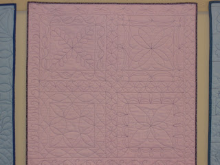 The most useful class was about threads and tensions. We had a list of threads that we went through and adjusted the tension and stitched until we got it right. We used 8 different kinds and I found out my machine can even use metallic and invisible threads. The second most useful class was pantographs. I had a class on these at Long-arm University but we all shared two different long-arms and only sewed for a few minutes on the techniques. This class we did a wall-hanging size and we had to space borders. I learned a lot and hope to do a few pantographs. The feather class was a disappointment. We were supposed to do a different type of feather. I tried to do them the way we were supposed to but the feathers I do on my own looked much better. The trapunto class was something I already knew how to do. It was a relaxing class for the last day. We were also shown how to sew a bag on the long-arm but it would be a lot easier on a regular sewing machine.