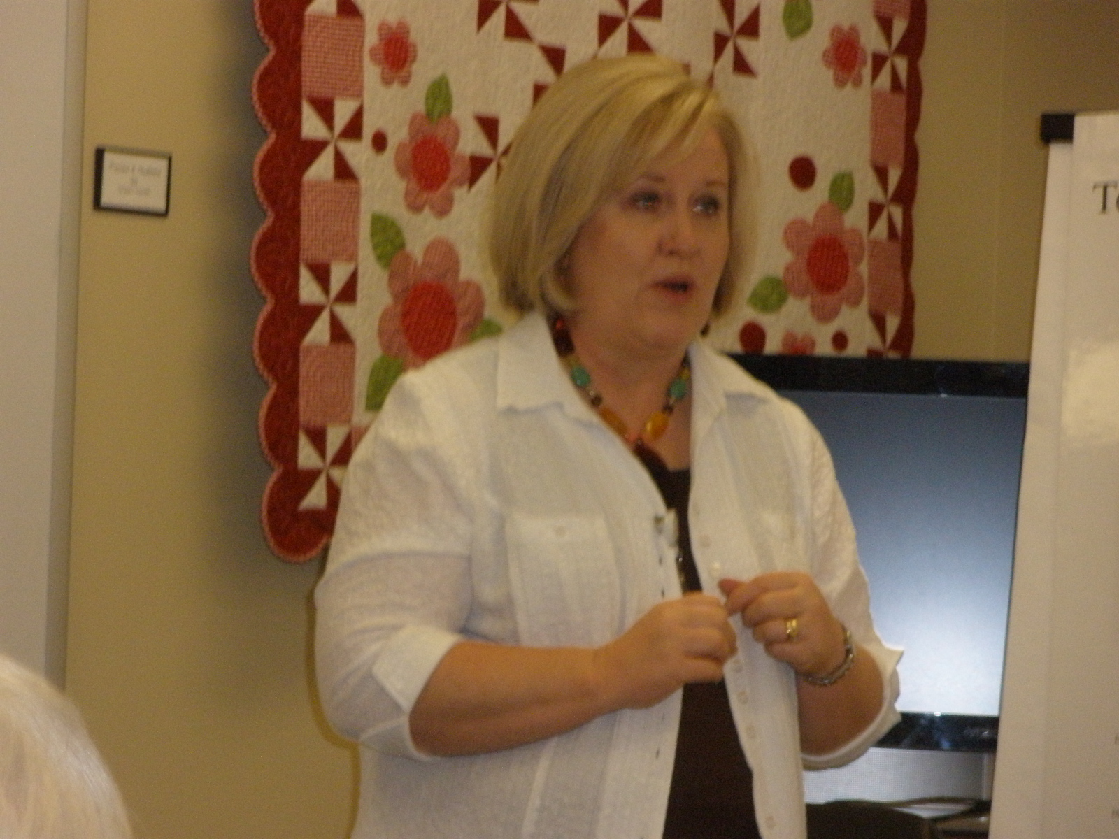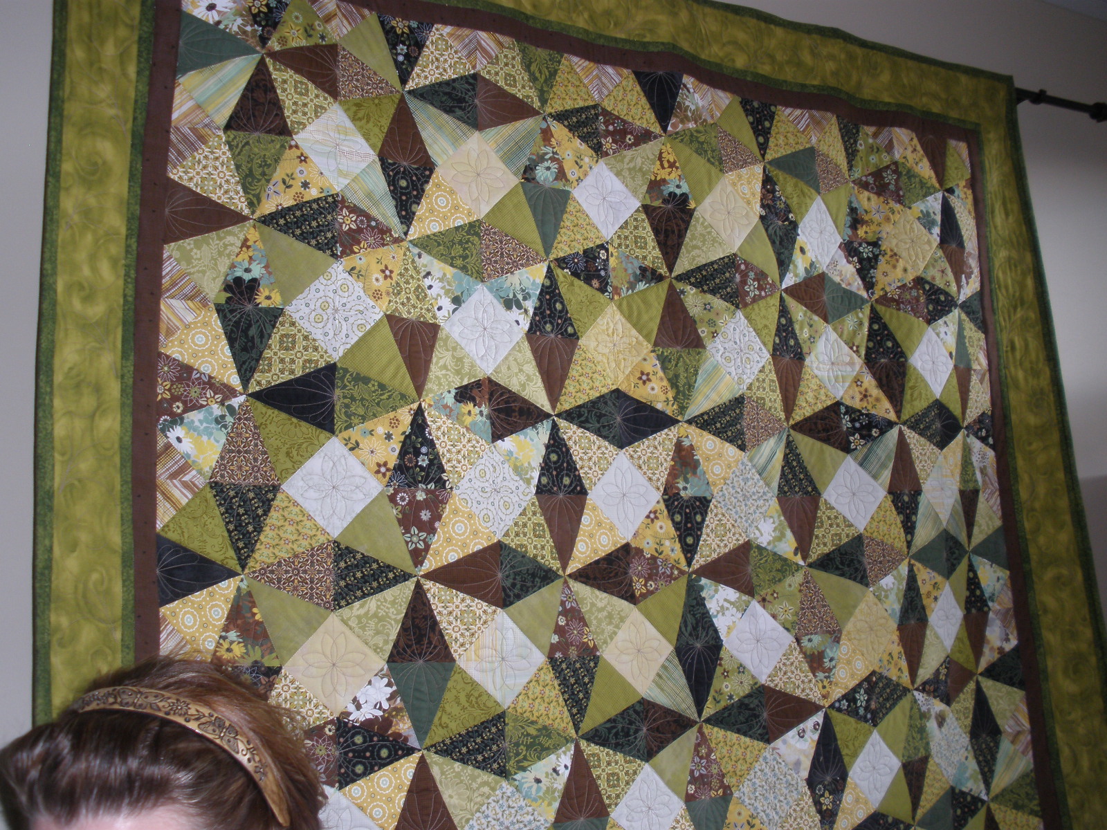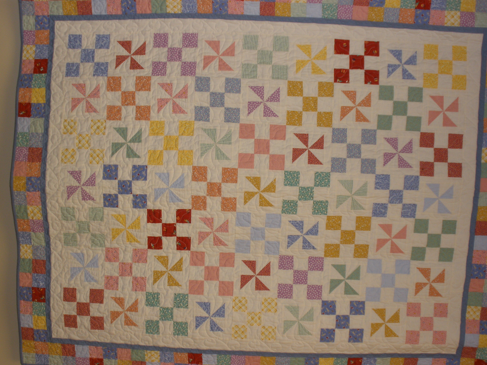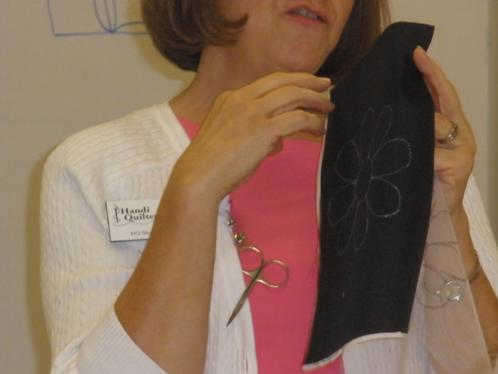 The most useful class was about threads and tensions. We had a list of threads that we went through and adjusted the tension and stitched until we got it right. We used 8 different kinds and I found out my machine can even use metallic and invisible threads. The second most useful class was pantographs. I had a class on these at Long-arm University but we all shared two different long-arms and only sewed for a few minutes on the techniques. This class we did a wall-hanging size and we had to space borders. I learned a lot and hope to do a few pantographs. The feather class was a disappointment. We were supposed to do a different type of feather. I tried to do them the way we were supposed to but the feathers I do on my own looked much better. The trapunto class was something I already knew how to do. It was a relaxing class for the last day. We were also shown how to sew a bag on the long-arm but it would be a lot easier on a regular sewing machine.