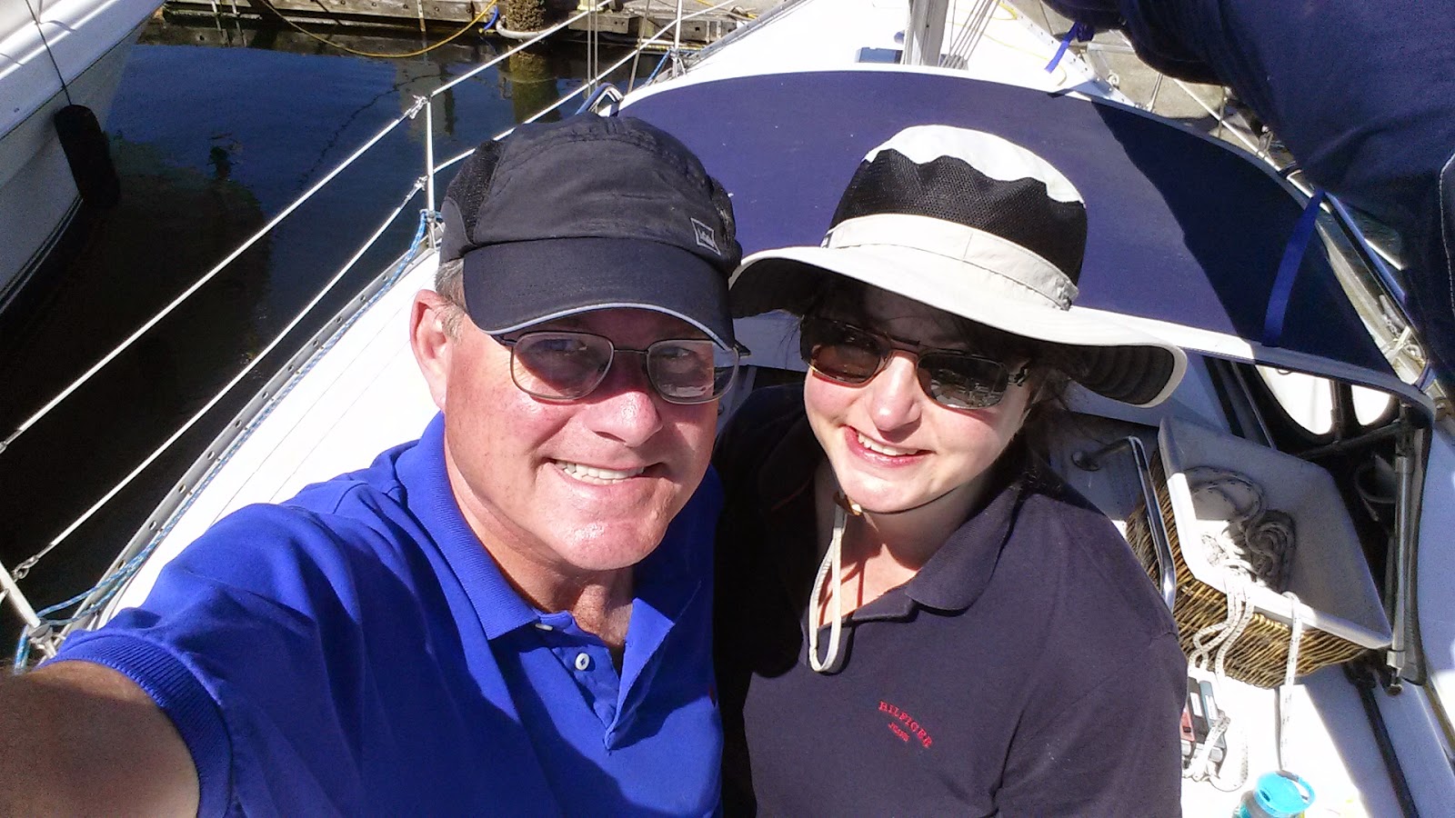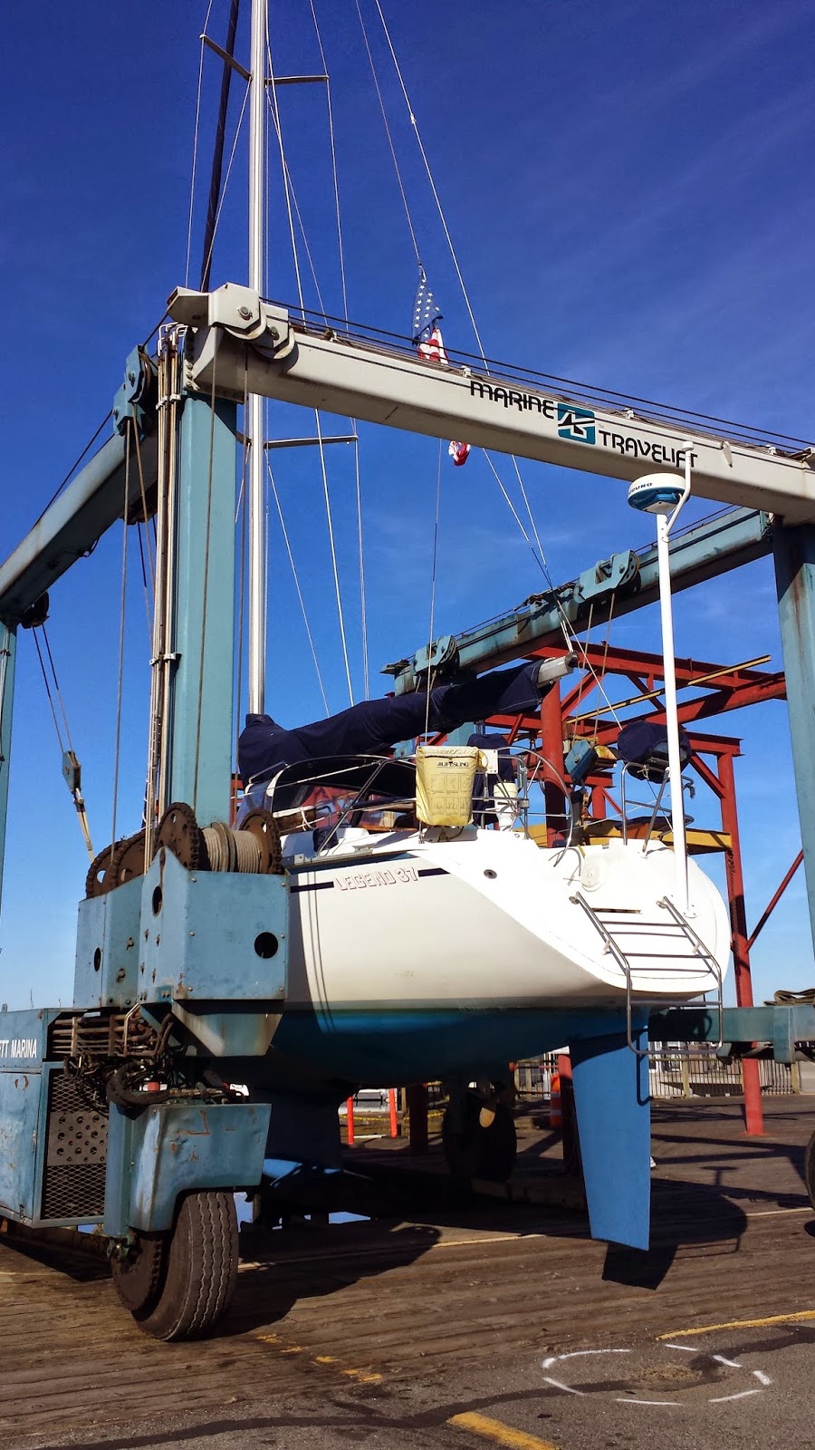We hope to have many fun adventures on our new sailboat, a 1987 Hunter Legend 37.5. We are co-owners of this boat with my brother, Joe. Our other sailboat, the 1973 Cal 24, is now up for sale on Craigslist. Mark and Joe sanded and painted the bottom of the keel. Two coats of paint were applied, making it a 2 day process. It was then gently lowered into the water by a rather neat machine called a Travelift.