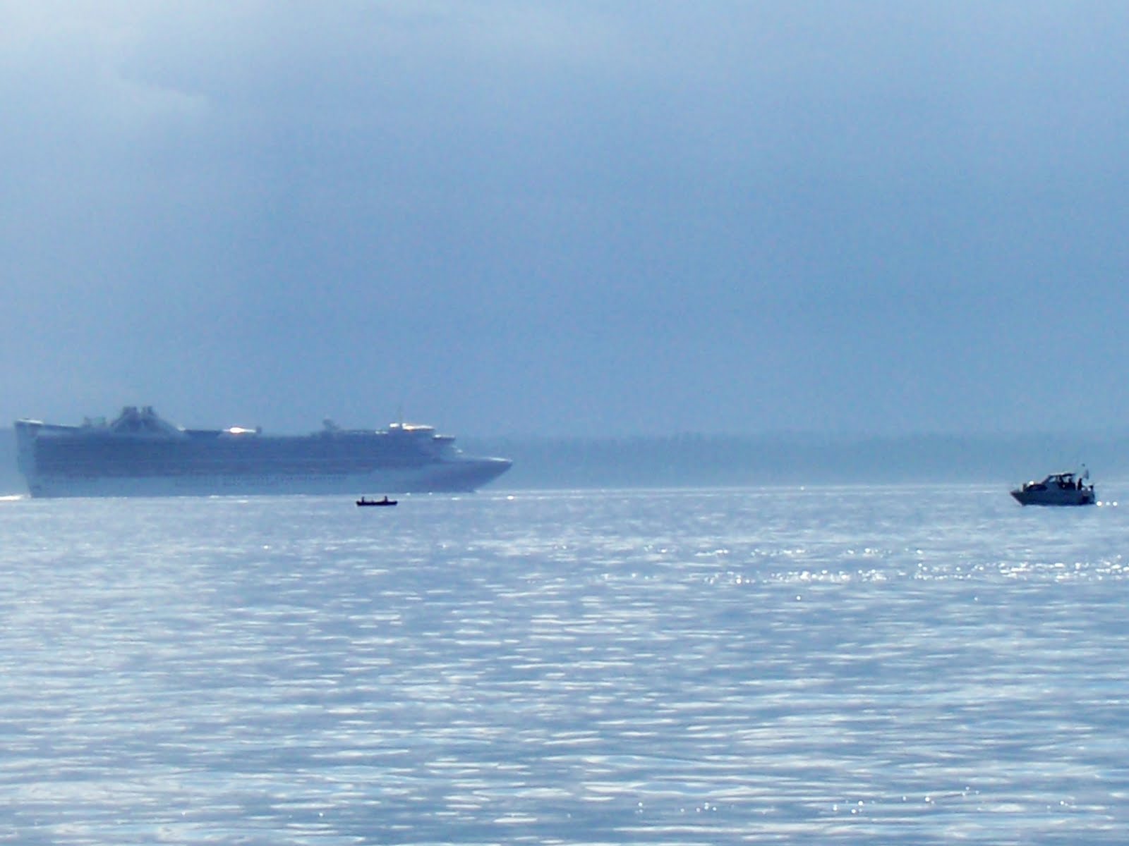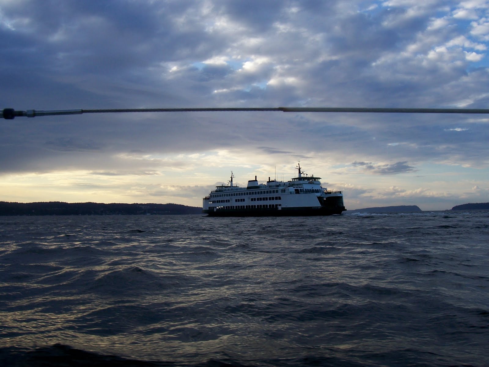 We left the Edmonds marina around 5:00 pm. Since it was so late and the wind had changed direction, Mark decided we should motor most of the way home. We both like to be under sail so this was a bit of disappointment. We love the serene calmness of silently gliding through the water. A little while after departing Edmonds the skies clouded up and the water got choppy. It was around this time that we saw three cruise ships off in the distance. Chloe was getting a bit huffy for her dinner so we fed her. In hindsight, we should have fed her early and pottied her again before we left. She later got a bit huffy again, but we were within sight of Everett so it wasn’t too bad. We also got to see two harbor porpoises swimming through the water. It was thrilling to see them. We’ve seen others up in Possesion Sound and I hope to capture them on film someday.