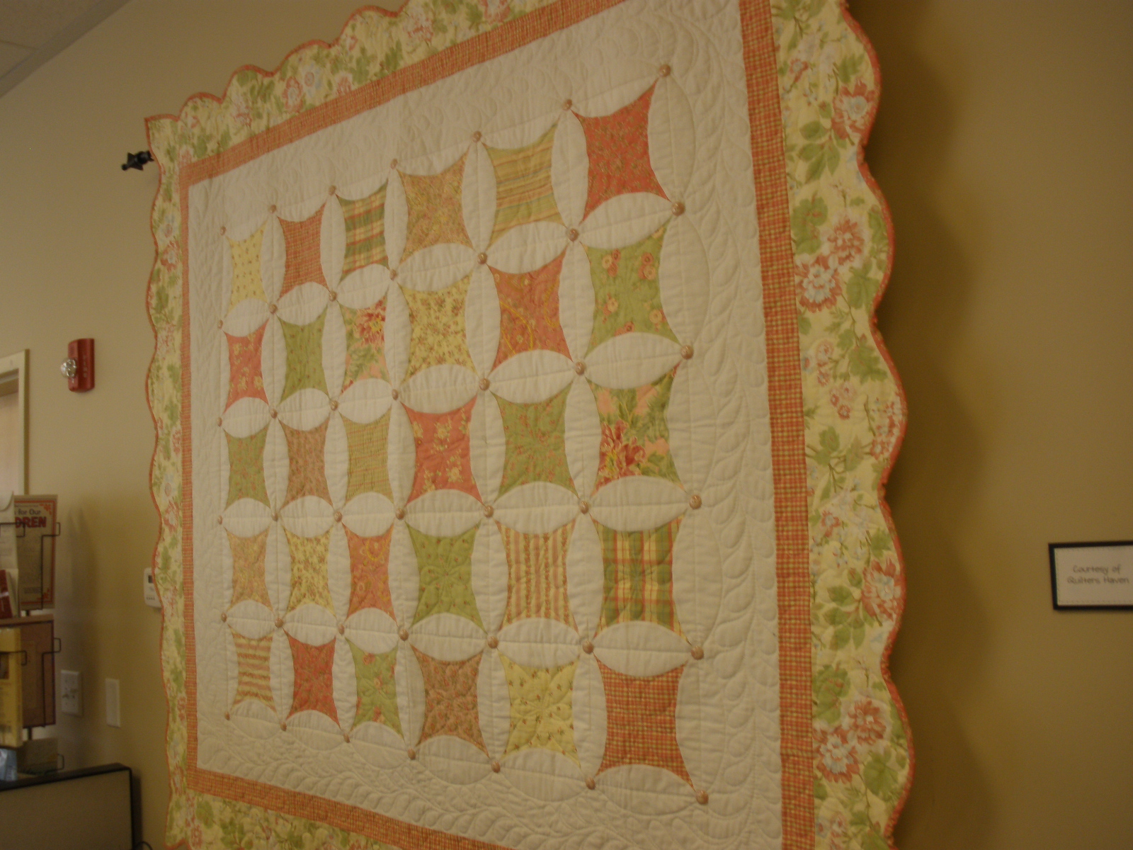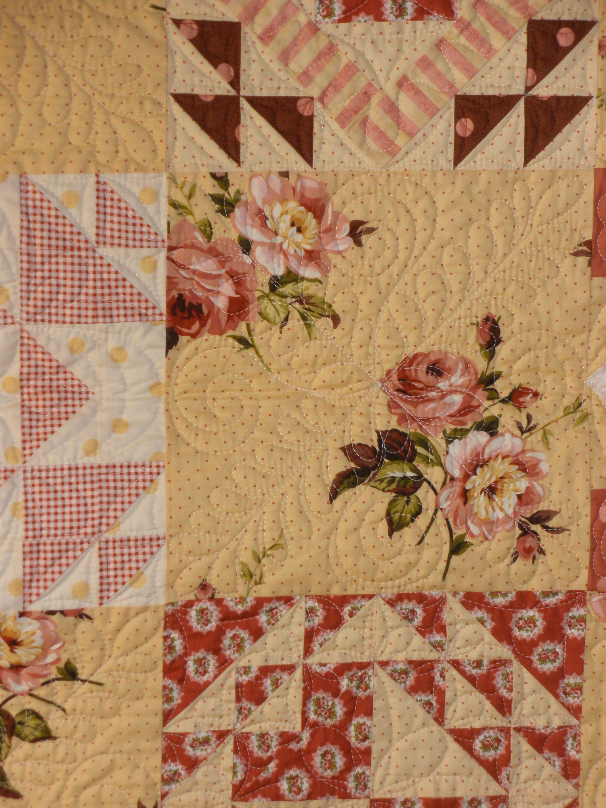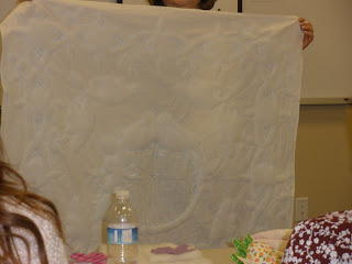 The most useful class was about threads and tensions. We had a list of threads that we went through and adjusted the tension and stitched until we got it right. We used 8 different kinds and I found out my machine can even use metallic and invisible threads. The second most useful class was pantographs. I had a class on these at Long-arm University but we all shared two different long-arms and only sewed for a few minutes on the techniques. This class we did a wall-hanging size and we had to space borders. I learned a lot and hope to do a few pantographs. The feather class was a disappointment. We were supposed to do a different type of feather. I tried to do them the way we were supposed to but the feathers I do on my own looked much better. The trapunto class was something I already knew how to do. It was a relaxing class for the last day. We were also shown how to sew a bag on the long-arm but it would be a lot easier on a regular sewing machine.